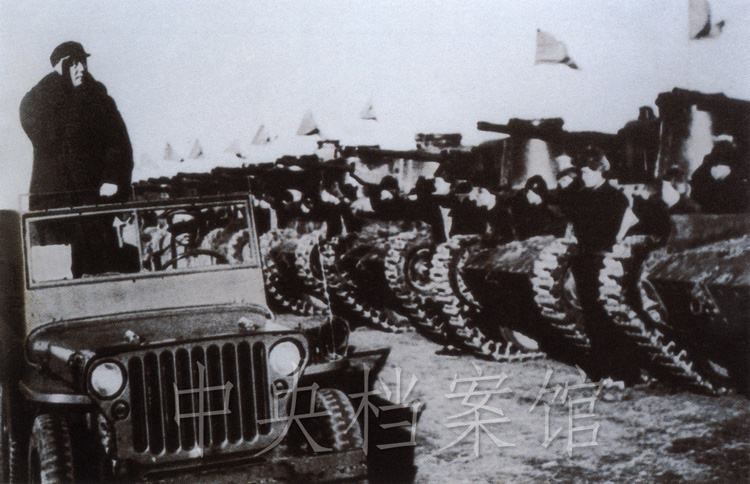 纪录片:(群众呼声)中国人民万岁!(纪录片解说)检阅开始了。东北野战军参谋长刘亚楼将军,向毛主席报告受检阅的部队全部到齐。坦克塔上飘扬着红旗,坦克手精神百倍,向着自己的领袖敬礼。