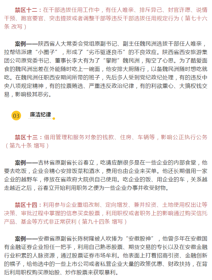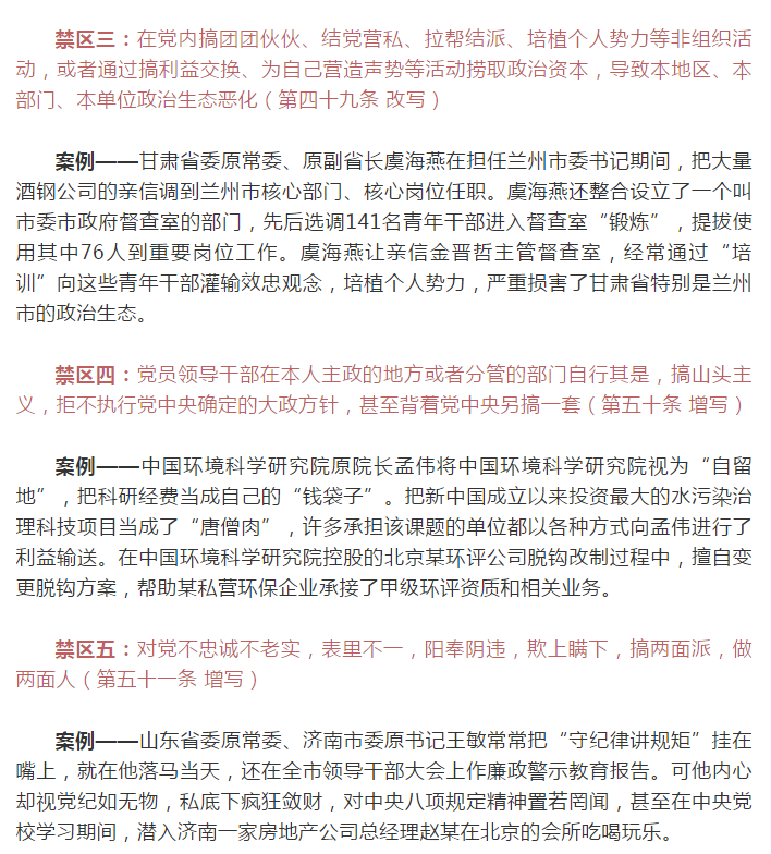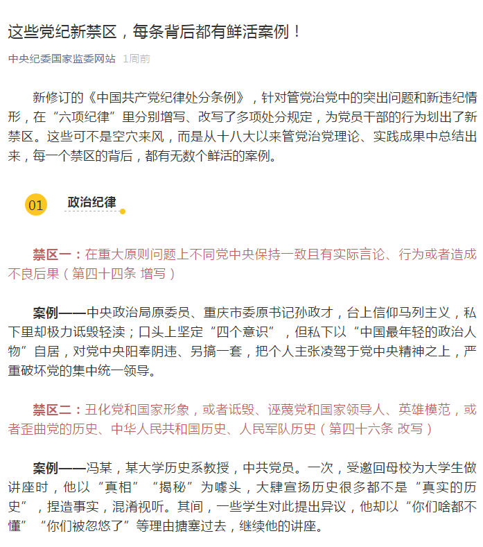 为强化对《中国共产党纪律处分条例》的学习,学先一步,学深一层,学用结合,集团纪委引用中央纪委国家监委网站的内容,带领大家从“典型案例”中深刻领会《条例》修订的重大意义,积极用《条例》武装头脑、筑牢防线,进一步增强纪律意识、规矩意识。下面,就让我们通过案例看一看这些不能触碰的禁区!
