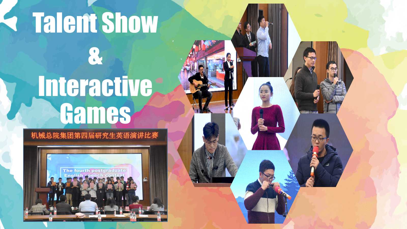 比赛间歇,来自材保所的张博闻表演了精彩的《带你走进西班牙足球》英文配音,来自轻量化院的闫丹丹和刘晓军带来了英文版吉他伴唱《成都》,来自机科股份的陈展带来了动听的口琴曲《爱尔兰画眉》,来自轻量化院的郭子桐演唱了英文歌曲《Nothing`s Gonna Change My Love For You》,让大家在紧张的比赛氛围中感受到轻松与愉悦。此外,“电影配音”、“英语绕口令”、“Describe and guess”等一系列小游戏活跃了现场气氛。
